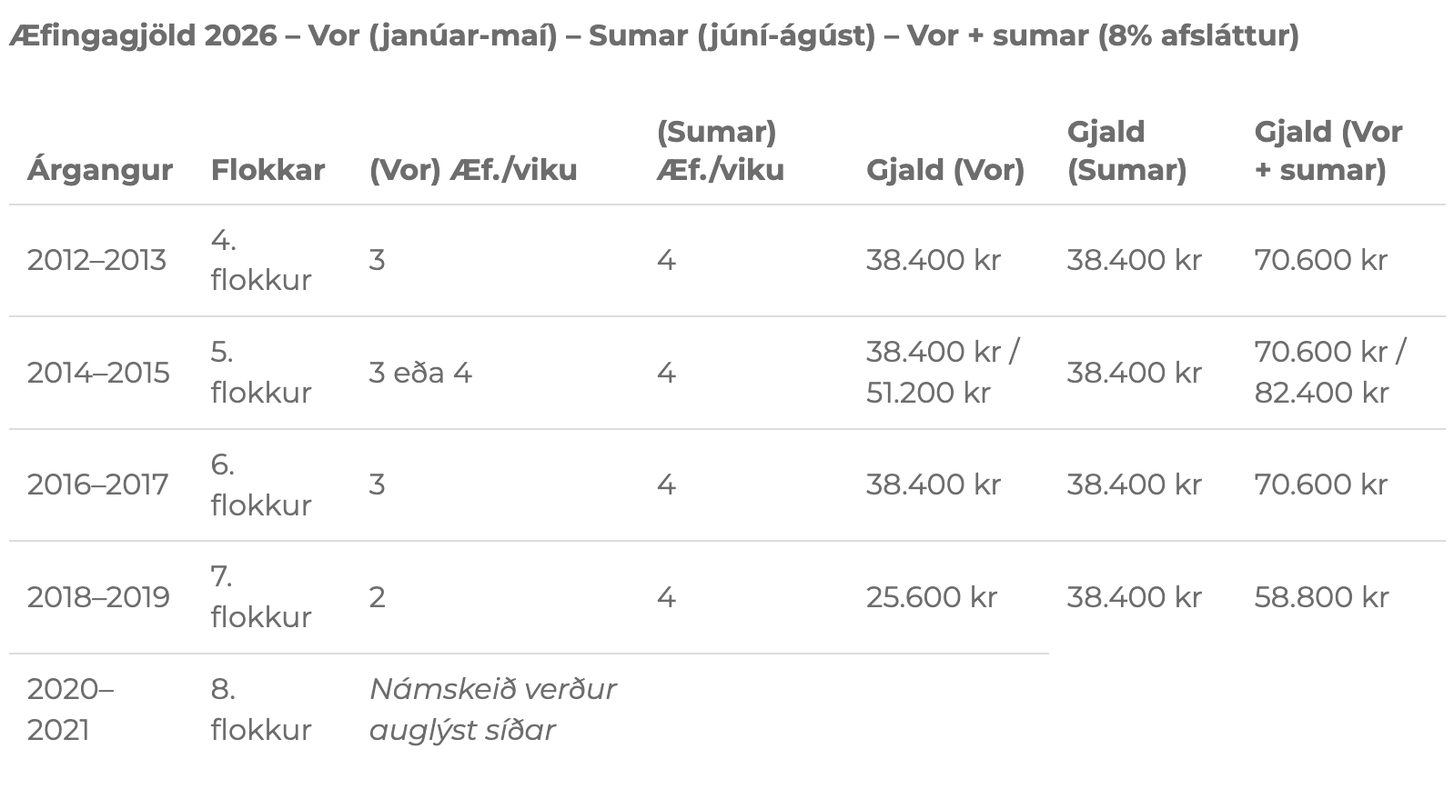 - Æfingagjöld hafa hækkað frá fyrra ári til samræmis við aukinn rekstrarkostnað.